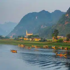 Vous partirez pour la célèbre cathédrale du Tonkin, « Phat Diem » un mariage architectural inspiré des pagodes et des temples tonkinois, elle est aussi surnommée “cathédrale de pierre” (« Nha Tho Da »), en raison de sa base faite de marbre. Continuez la découverte de la région au cours d’une balade à vélo (10km) le long de la digue longeant la réserve de Van Long, puis vous embarquerez à bord de petites barques à rames pour une promenade d’environ 1h30 à travers les rizières et le paysage spectaculaire de pitons rocheux, de canaux et de végétation.