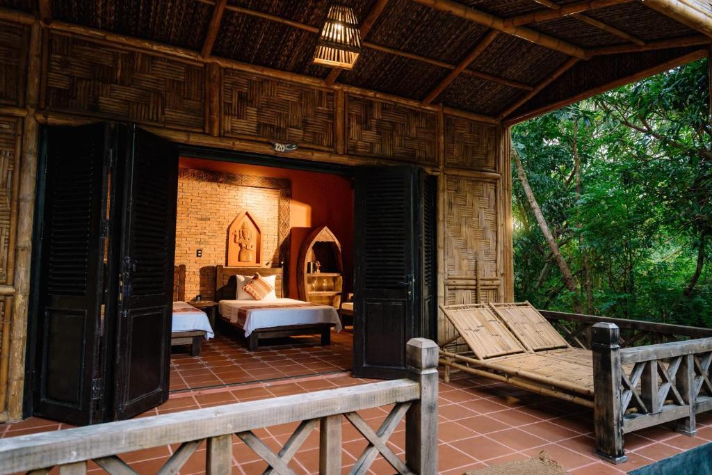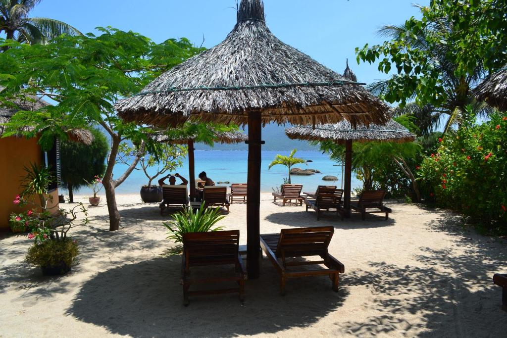 Le resort propose une vingtaine de bungalows traditionnels en bambou, directement sur la plage ou en léger retrait dans le jardin. Les chambres sont volontairement simples : lits équipés de moustiquaires, ventilateur sur pied, salle de bain privative avec douche, pas de climatisation ni de télévision, et le Wi‑Fi uniquement dans les espaces communs. Tout est pensé dans un esprit éco‑responsable et minimaliste, pour privilégier le cadre et la déconnexion plutôt que le confort « hôtel de ville » ; certains voyageurs mentionnent la chaleur nocturne ou la présence d’insectes, inhérentes à ce type de lieu en pleine nature.