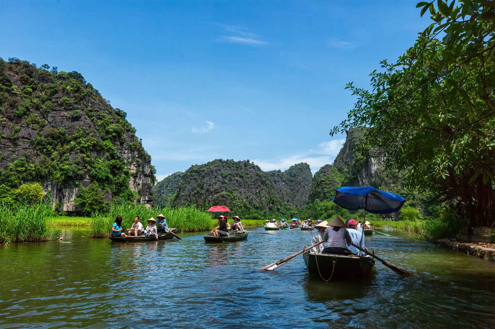 L’expérience vécue à Tam Coc est totalement unique. Prenez place dans de petits sampans et laissez vous guider au milieu de ce cadre enchanteur ! La visite de Tam Coc, d’une durée d’environ 3 heures, ne peut se faire que par la rivière de Ngo Dong, qui traverse en zig zag cet océan de rizières verdoyantes. Le sampan passe successivement de l’une à l’autre des trois grottes creusées dans de d’immenses pitons calcaires : Hang Ca, la première grotte est longue de 127m, Hang Giua mesure 70m de long et la dernière, Hang Cuoi atteint 45m.